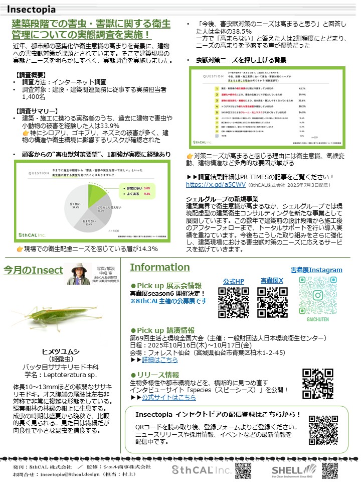 今月号の特集 ◆害蟲展season6 いよいよ東京・大阪で開催! ◆建築段階での害虫・害獣に関する衛生管理についての実態調査を実施! ぜひご覧ください。